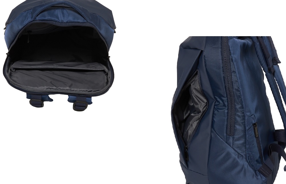 左右の脇マチ側から出し入れする比翼式のスラッシュポケットにはそれぞれペットボトル、55cm の折りたたみ傘が収納できます。