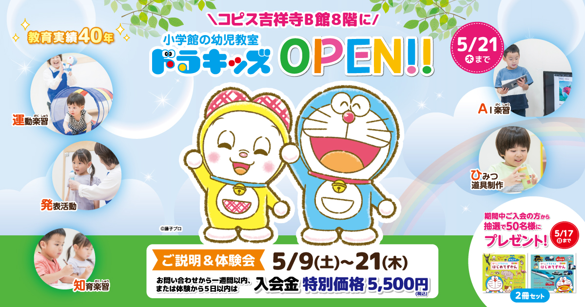 期間中ご入会の方から抽選で50名様に「ドラえもんはじめてずかん(えいごつき)」2冊セットプレゼント!