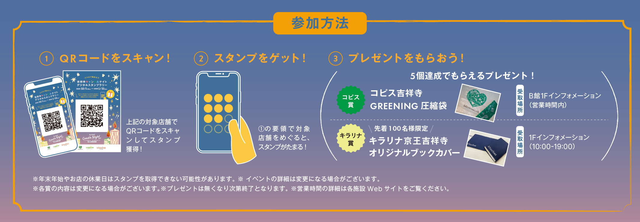 4つのエリア( セントラルエ リア・ウエストエリア・イー ストエリア・パークエリア) にあるキャンドルスポットでQRコードをスキャンしてスタンプを獲得しよう!